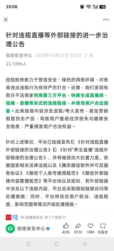2025年10月的整頓風暴標志著私域直播進入“強監管時代”。國家市場監督管理總局出臺《私域直播運營規范》,明確平臺責任、廣告審核、售后標準等紅線,同時要求直播視頻與交易記錄保存不少于三年。微信等平臺通過“穿透式”核查鎖定實際經營者,對違規鏈接實施“播完即刪、解散群組”的連帶處罰。
